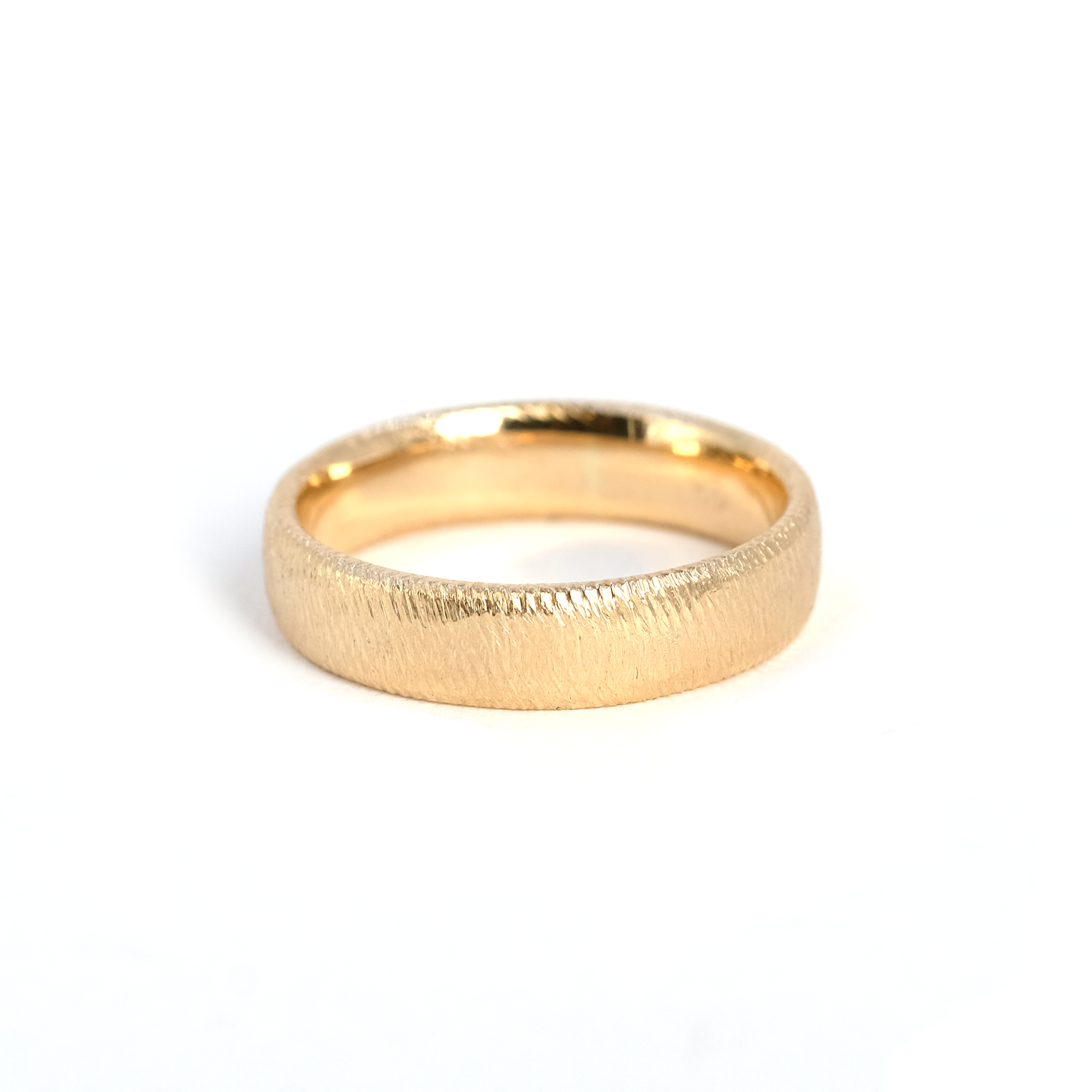 Båndring i 14 k guld - 6 mm bred (herre). Overflade med file spor eller blank.