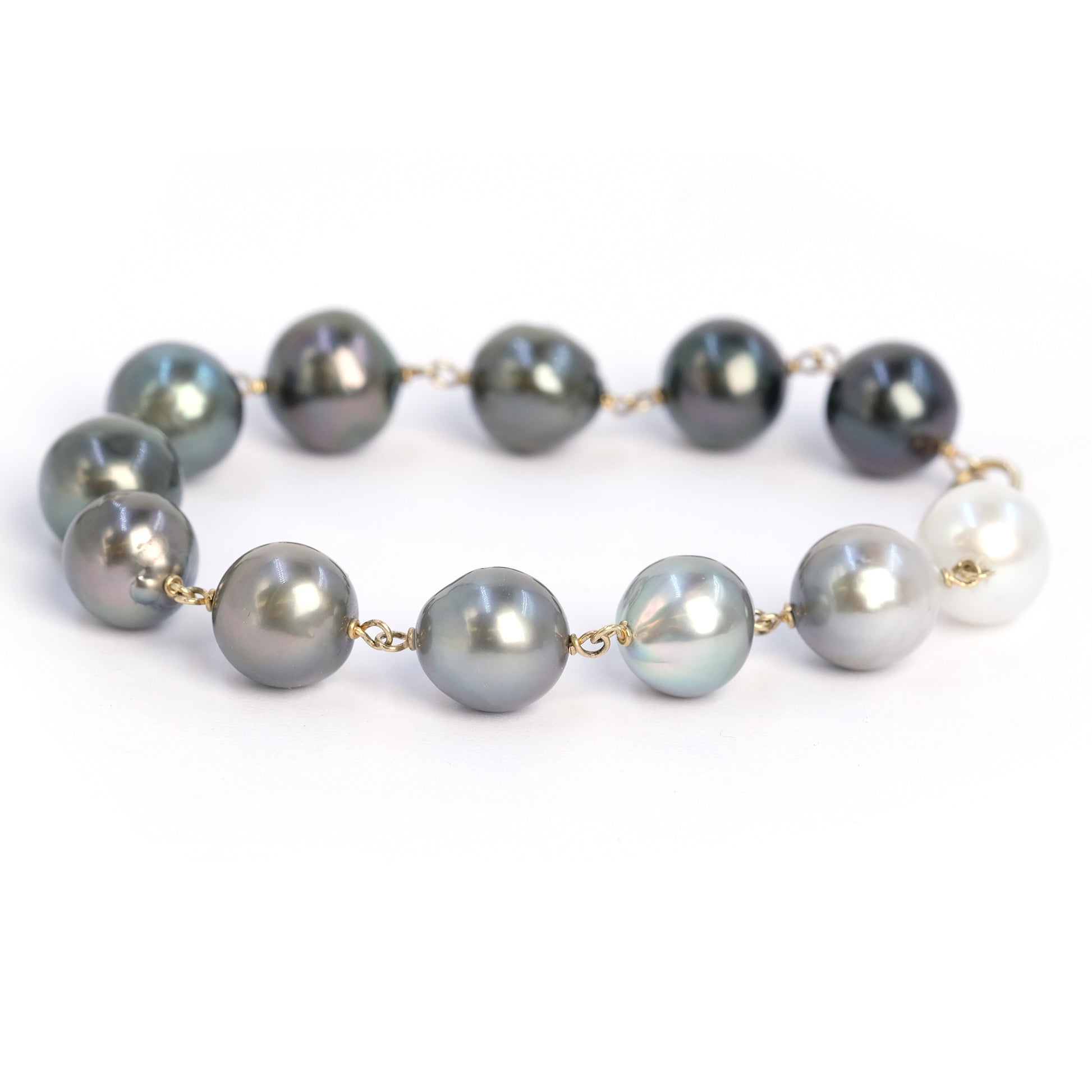 Perlearmbånd med tahitiperler i farve forløb samt en enkelt hvid south sea perle. Viklet på 14 k guld
